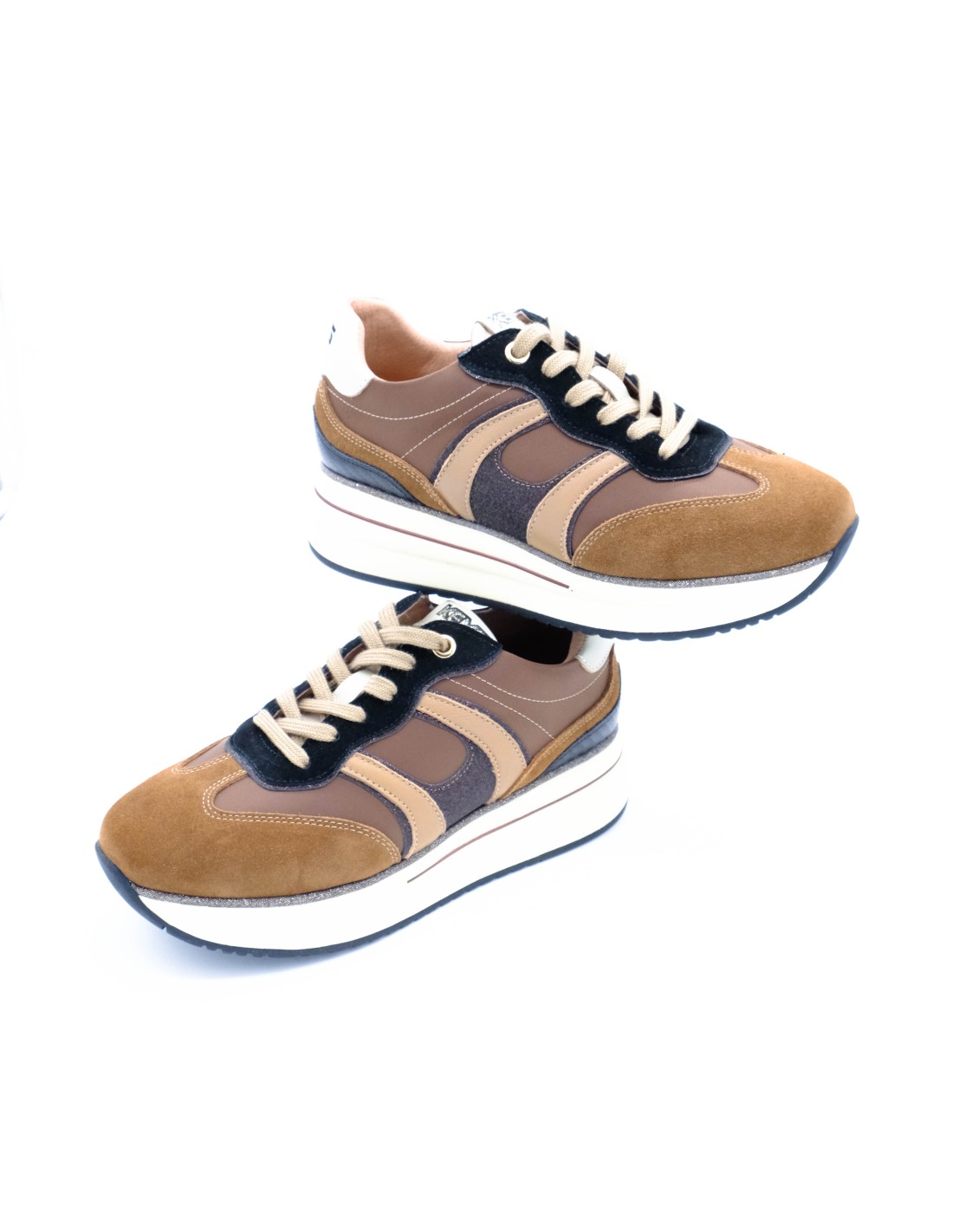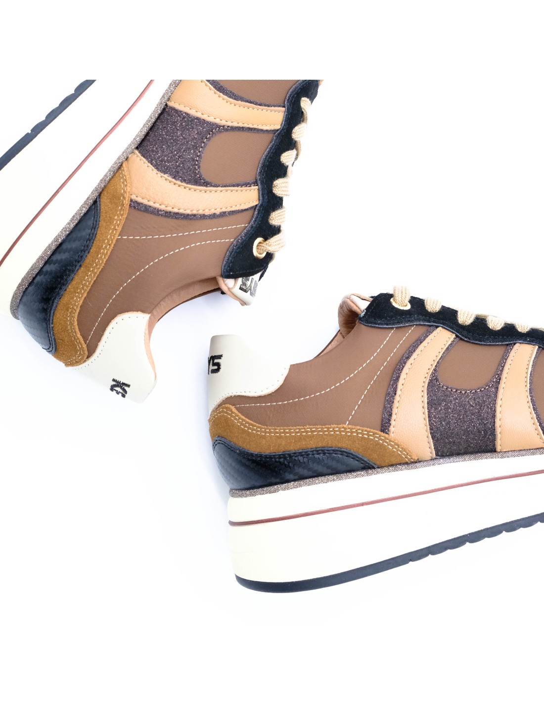 Il mix perfetto tra praticità e stile: le sneaker Keys uniscono la morbidezza della pelle e del suede ai detagli luminosi in glitter e inserti in raso che catturano subito l’occhio.